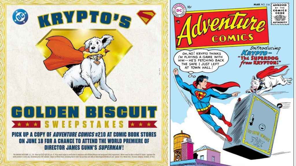 Here’s the deal: DC is reprinting Adventure Comics #210, the 1955 issue where Krypto the Superdog made his debut, and stuffing two copies with “Krypto’s Golden Biscuit.” Find one, and you and a guest get flown out to the Superman movie premiere in Los Angeles this July. Polybagged nostalgia with a sweepstakes twist. It’s kind of brilliant in a “we’re out of ideas” way.